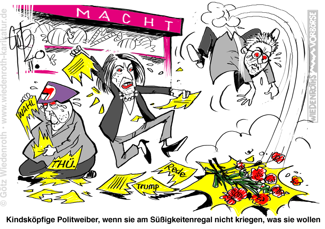 Vorbörse vom 06. Februar 2020: Regredierende SozialistInnen: Wahlergebnisse und Manuskripte zerreißen. Blumensträuße vor die Füße werfen. Merkel, Pelosi und Hennig-Wellsow |