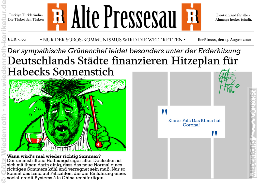 Vorbörse vom 13. August 2020: Relotius-Qualitätsmedium "Alte Pressesau" macht auf: Klima stirbt an Corona. Habeck hat bereits Sonnenstich! Nationaler Hitzeplan muß her! |