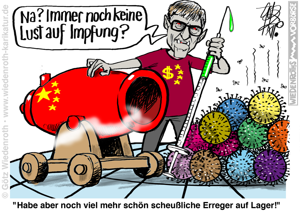 Vorbörse vom 30. Dezember 2020: "Na? Immer noch keine Lust auf Impfung?" Promotor chinesischer Verhältnisse wippt ungeduldig mit der Kanüle. Bunte Virenvielfalt zu seinen Füßen. |