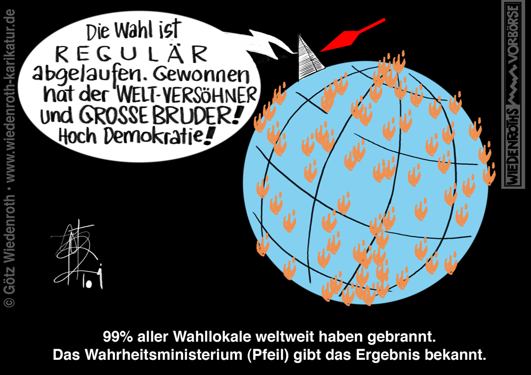 Bildunterschrift: 99% aller Wahllokale weltweit haben gebrannt. Das Wahrheitsministerium (Pfeil) gibt das Ergebnis bekannt. |