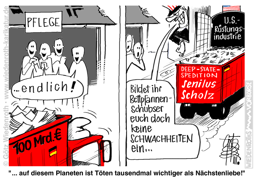 Vorbörse vom 22. März 2022: Deep-State-Spedition Senilus Amnesius Scholz: Den "Pflegehelden" den Mund wäßrig machen, aber dann doch lieber die US-Rüstungsschmieden bedienen. |