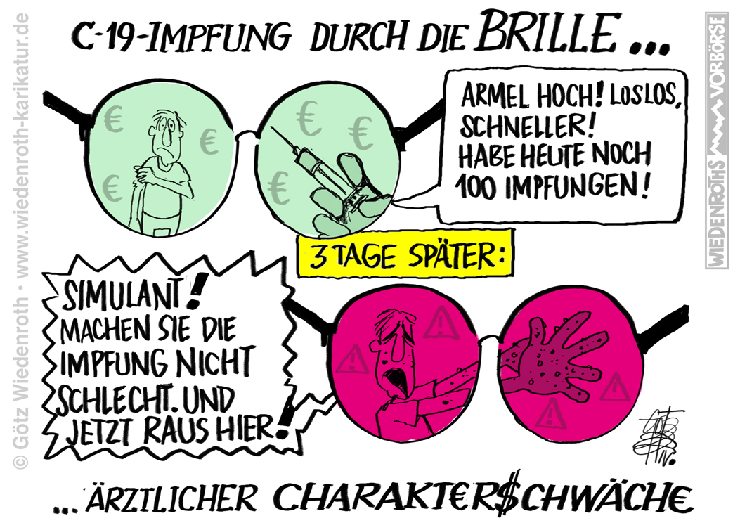 Bildunterschrift: C-19-Impfung durch die Brille ärztlicher Charakterschwäche. |