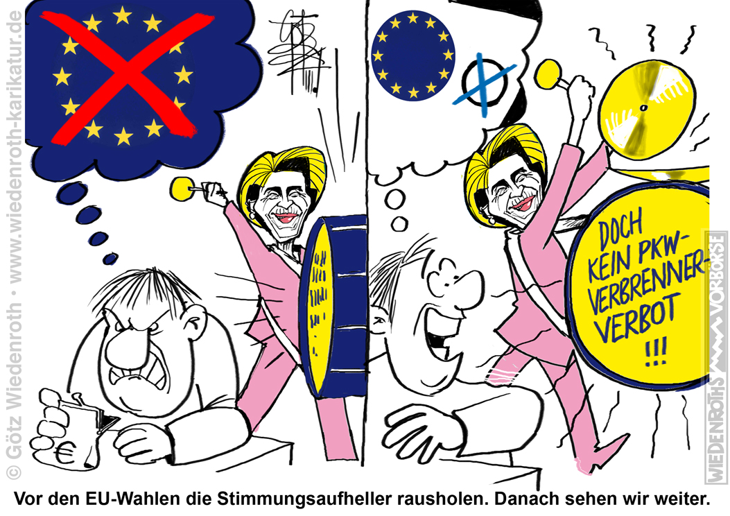 Vorbörse vom 08. März 2024: EUdSSR-Verbrennerverbot: rin in die Kartoffeln, raus aus die Kartoffeln. Chaos nimmt das Politbüro gern in Kauf, wenn es nur die Wähler besänftigt. |