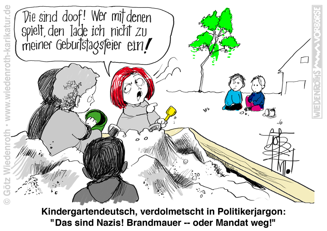 Bildunterschrift: Kindergartendeutsch, verdolmetscht in Politikerjargon: "Das sind Nazis! Brandmauer -- oder Mandat weg!" |