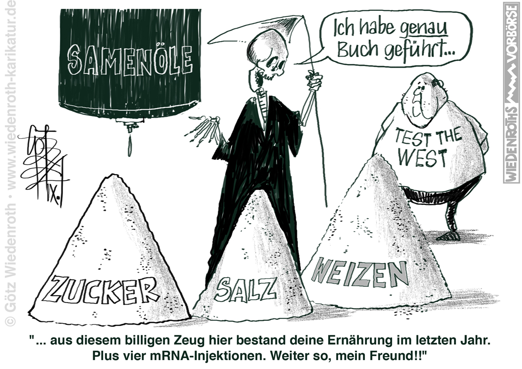 Bildunterschrift: "... aus diesem billigen Zeug hier bestand deine Ernährung im letzten Jahr. Plus vier mRNA-Injektionen. Weiter so, mein Freund!!" |