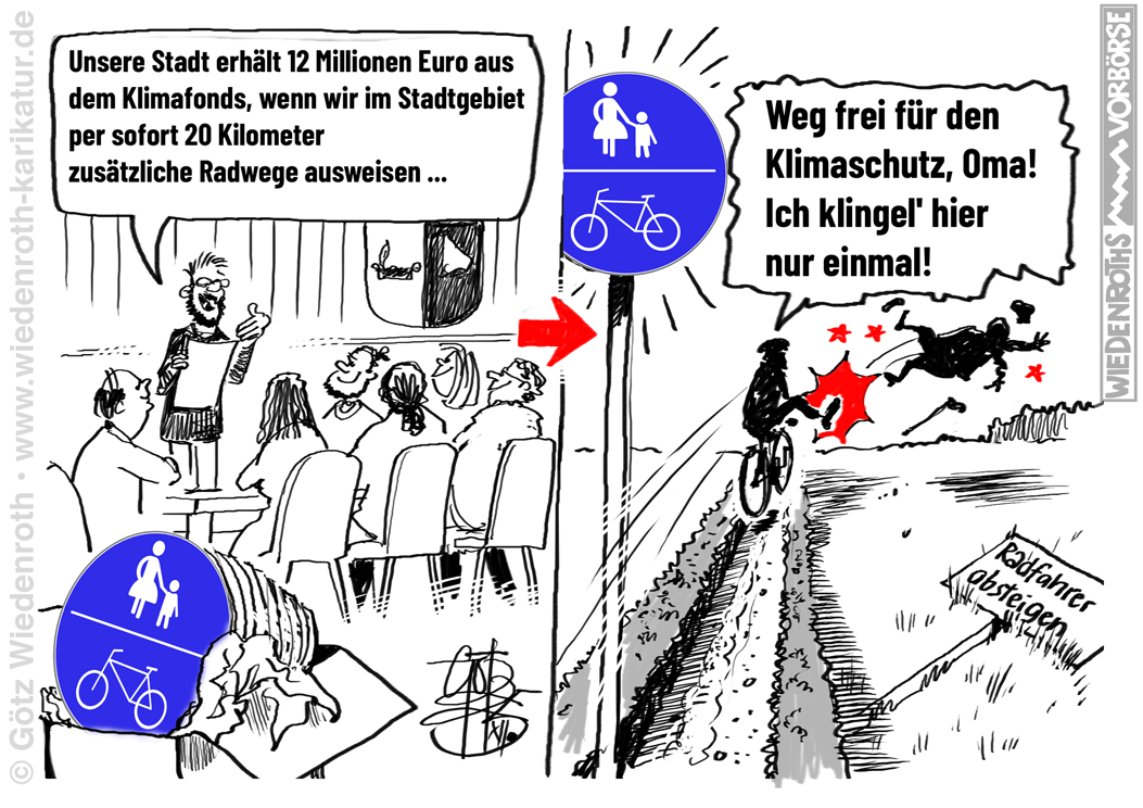 Bildunterschrift: "Weg frei für den Klimaschutz, Oma! Ich klingel' hier nur einmal!" |